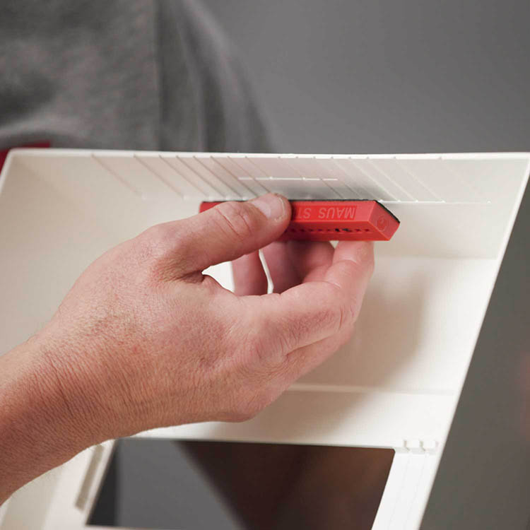 MAUS Stixx Pro har en selvheftende bakside og monteres direkte i rommet som skal beskyttes. Den kompakte størrelsen på 9,8 x 1 x 1,8 cm gjør at den enkelt får plass selv i trange rom der tradisjonelle brannsikkerhetsløsninger ikke får plass. Den fungerer helt frittstående og krever verken strømforsyning, trykksatte beholdere eller kabeltrekking.