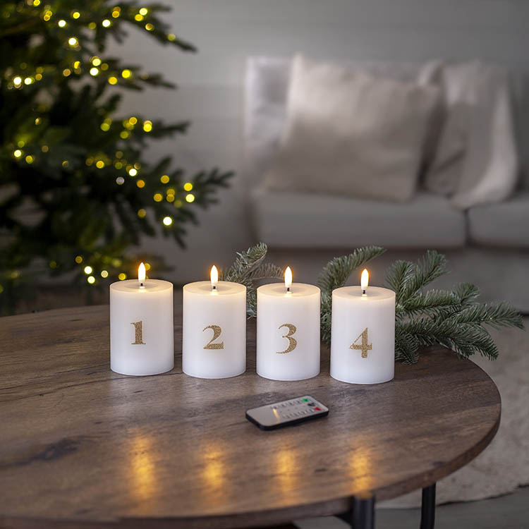 Lysene er laget i hvit stearin, noe som gir dem et realistisk utseende. Hvert lys er prydet med et gullsiffer fra 1 til 4 for å markere adventssøndager. Med en høyde på 12,5 cm og diameter på 7,5 cm passer de utmerket på fat, i vinduet eller på spisebordet.Trygg LED-teknikk
