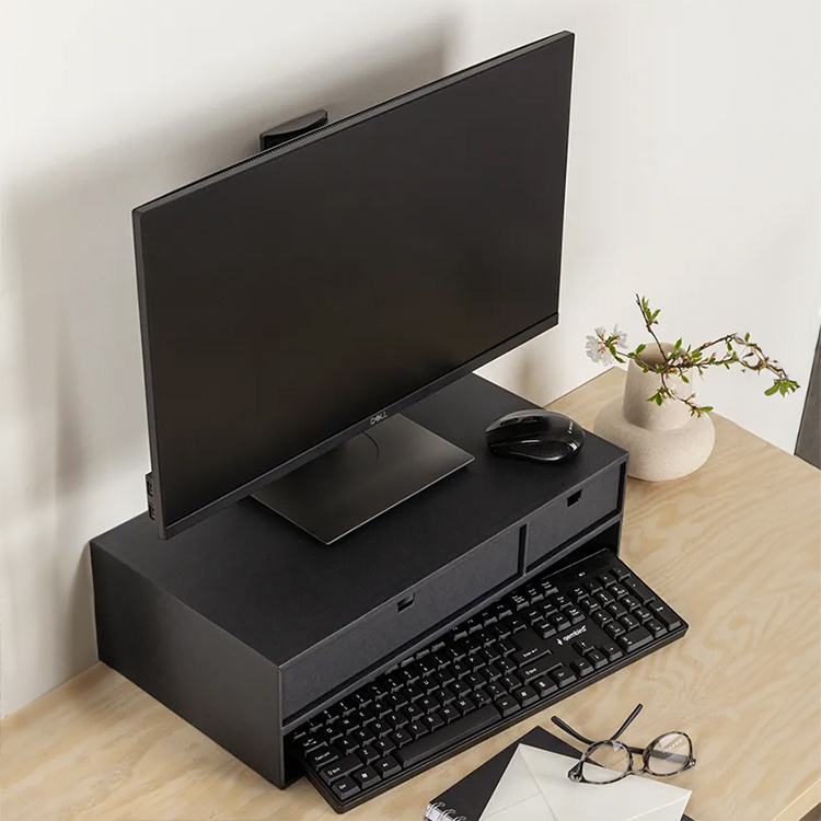 Skjermstativet har to innebygde skuffer i ulike størrelser. Den større skuffen er 32 cm bred, noe som gjør den perfekt for dokumenter og notatblokker. Den mindre er 14,5 cm bred og passer utmerket for penner, ladere, post-it-lapper og andre småting som ellers lett sprer seg over skrivebordet. Skjermstativet finnes i to farger, svart eller beige.Praktisk hylle for tastaturet