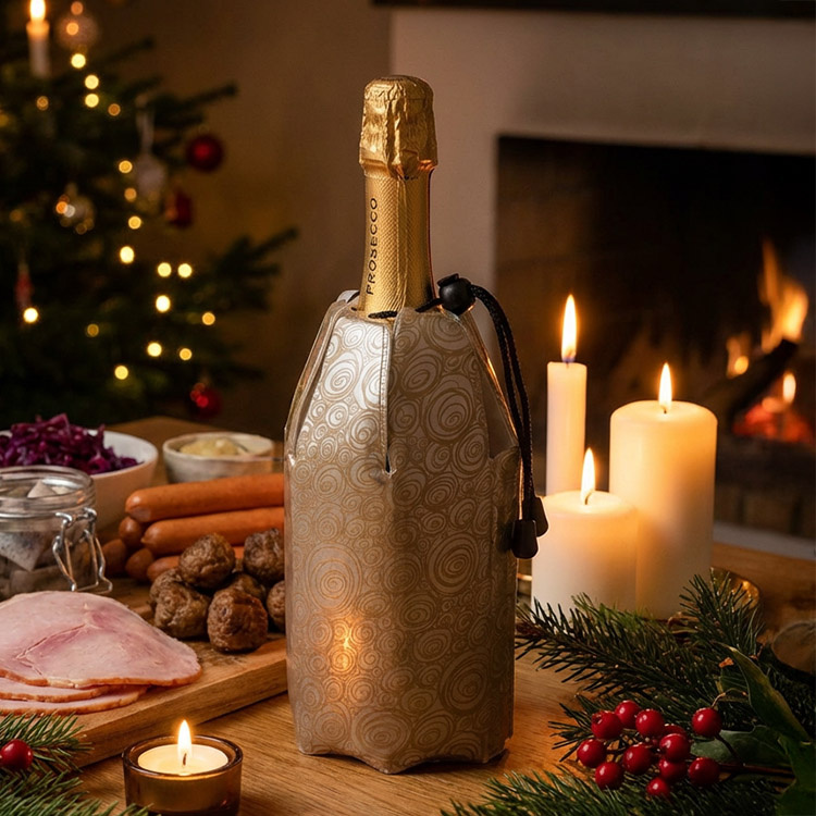 Flaskekjøleren passer cava-, prosecco-, vin- og champagneflasker som rommer mellom 0,7 liter og 1 liter. Ta flaskekjøleren ut av fryseren og træ kjøleren over flasken. Stram snoren slik at den sitter tett inntil flasken. La kjøleren sitte på så lenge det er drikke igjen i flasken, så holdes drikken kjølig lenger.