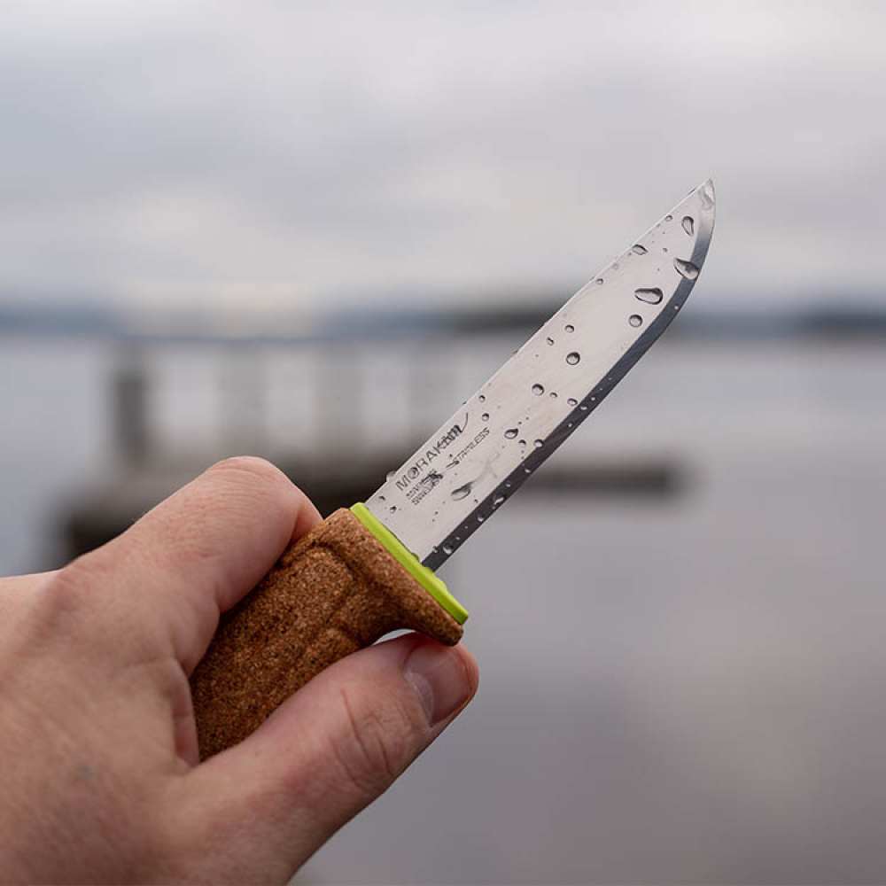 Den svenske Morakniven flyter hvis den havner i vann, i tillegg til at den lette vekten gjør den perfekt å ha med på tur. Det skarpe bladet gjør det til en god allroundkniv som kan takle det meste, og det komfortable korkhåndtaket er behagelig å holde i og gir et naturlig og godt grep under våte forhold. Bladet er laget av svensk rustfritt stål av høy kvalitet og kan brukes i fuktige omgivelser.