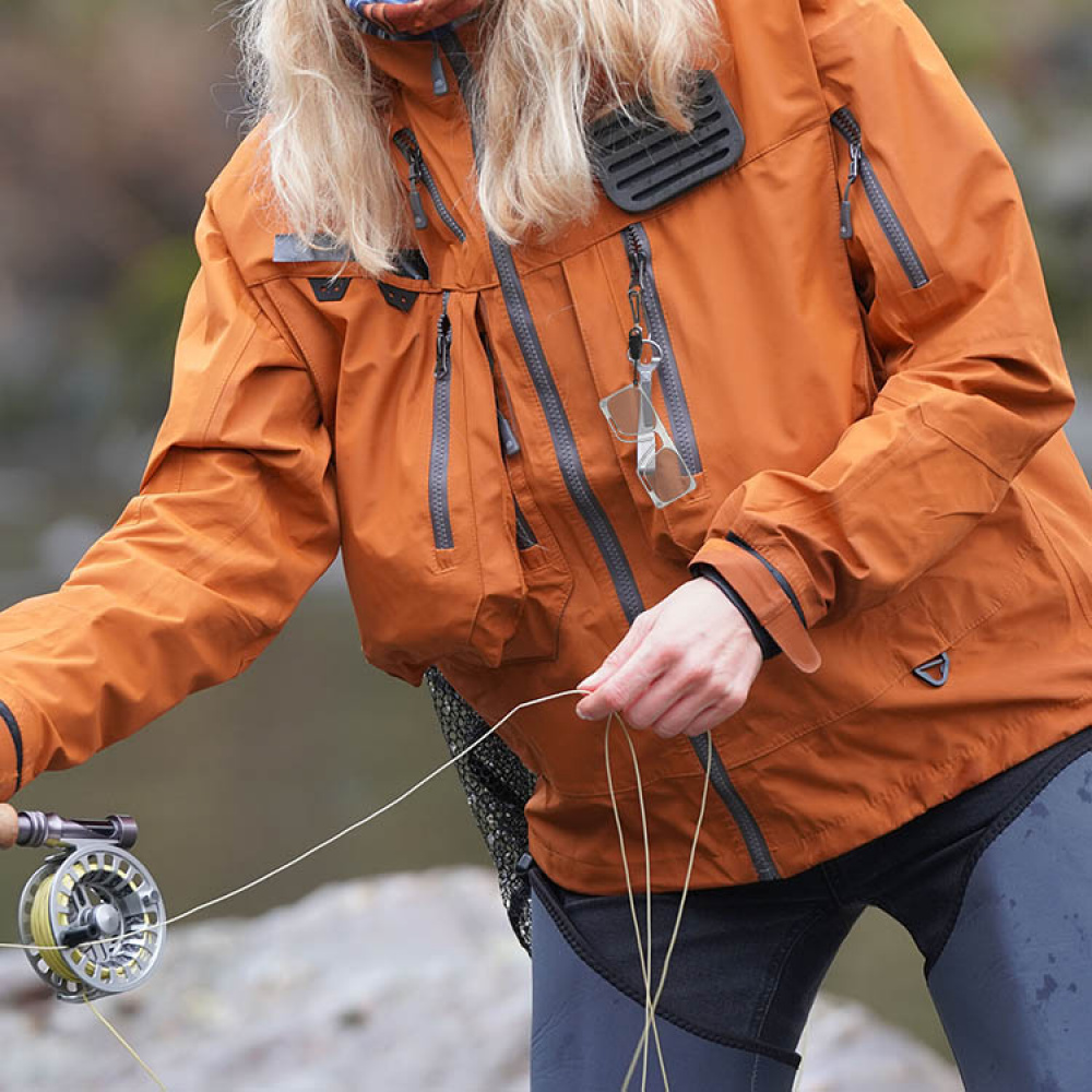 Forstørrelsesglassene er festet til karabinkroken med en snor og en liten plastspenne. Med plastspennen kan du enkelt hekte av brillene fra arbeidstøyet, jakken eller fluefiskevesten med én hånd. Når du trenger litt ekstra forstørrelse, er det bare å løsne plastspennen fra karabinkroken og plassere forstørrelsesglasset på nesetippen.