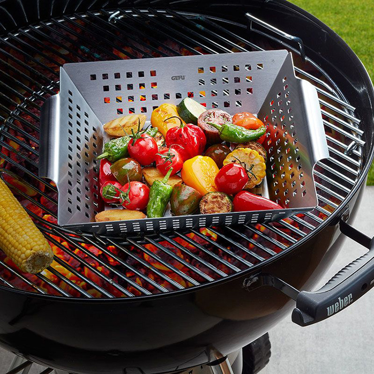 Grillkorgens firkantede perforeringer i bunnen og sideveggene slipper gjennom varmen effektivt. Det gir en jevn tilberedning og en fin grilloverflate på alt du legger i korgen. Resultatet blir saftige grønnsaker med herlig grilling.Perfekt for små råvarer