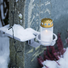 Holderen for gravlys monteres enkelt uten verktøy. Du klikker den fast på grunnholderen og kan når som helst bytte ut eller ta den bort, uten å påvirke gravstenen.Svensktillverkad kvalitet