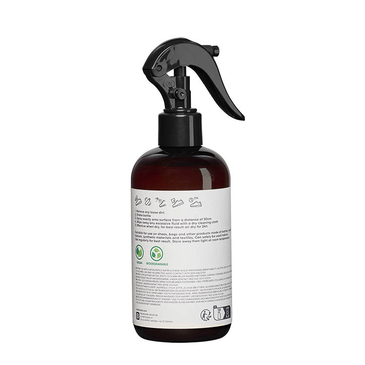Denne impregneringssprayen gir et effektivt beskyttelse for sko, klær og andre tekstiler. Den fungerer på flere forskjellige materialer, fra lær og semsket til syntet og Gore-Tex, uten å skade materialets pusteevne. Den vannbaserte formelen er dessuten miljøvennlig og OEKO-TEX-sertifisert. Samtidig etterlater sprayen en mild og naturlig duft.