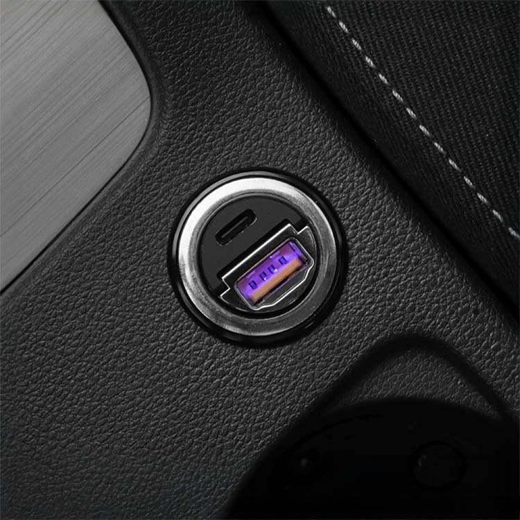 Den minimalistiske billaderen smelter inn i interiøret og sitter helt i nivå med sigarettuttaket uten å stikke ut. En liten innfellbar løkke gjør det enkelt å ta ut laderen når den ikke brukes.