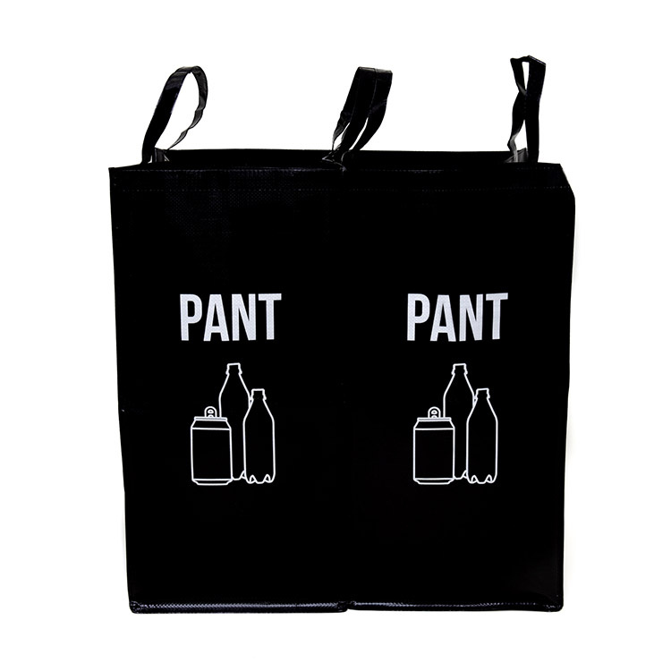 De to svarte posene har praktiske håndtak, som gjør det enkelt å bære dem til pantestasjonen. Posene er laget av slitesterk PP-stoff og er enkle å skylle dersom det skulle dryppe fra boksene.