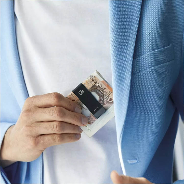 Den avtagbare klipsen kan brukes enten for å holde sedler samlet eller for å feste kortholderen i bukselinningen eller et belte. Kortholderen er laget av slitesterke materialer og har et kompakt format på 70 × 115 mm med en vekt på kun 35 gram.
