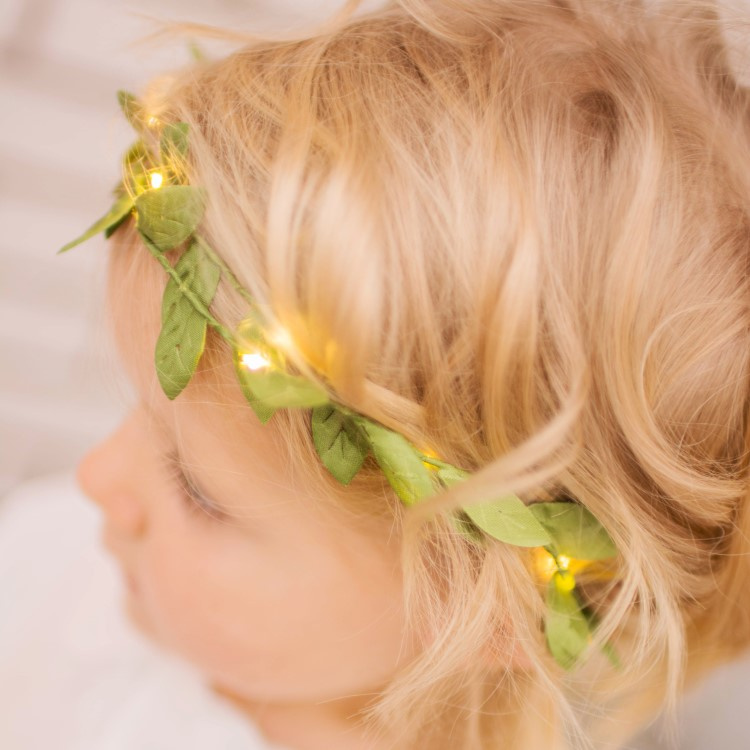 Denne lille fine lyslenken, med små grønne blader på, er fin å pynte bordet med eller til å lage en pen krans i håret med. Lysene på den batteridrevne lyslenken er spredt langs de grønne bladene, og når du setter på lysene, så vil den lyse opp stedet med et fint varmt hvitt lys.