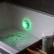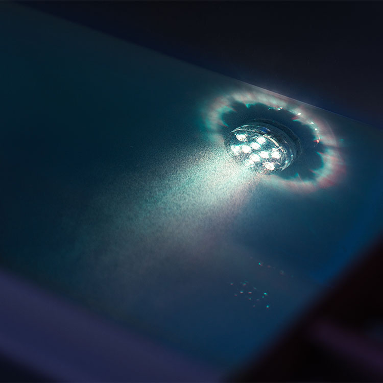 Vanntett og kompakt badekarlampe med tilhørende fjernkontroll. 12 ulike farger og 4 fargemoduser gjør det mulig å sette stemningen og skape en avslappende atmosfære. Lampen festes med sugekopper direkte på badekaret eller en annen egnet overflate og dimmes i 11 trinn ved hjelp av den medfølgende fjernkontrollen.