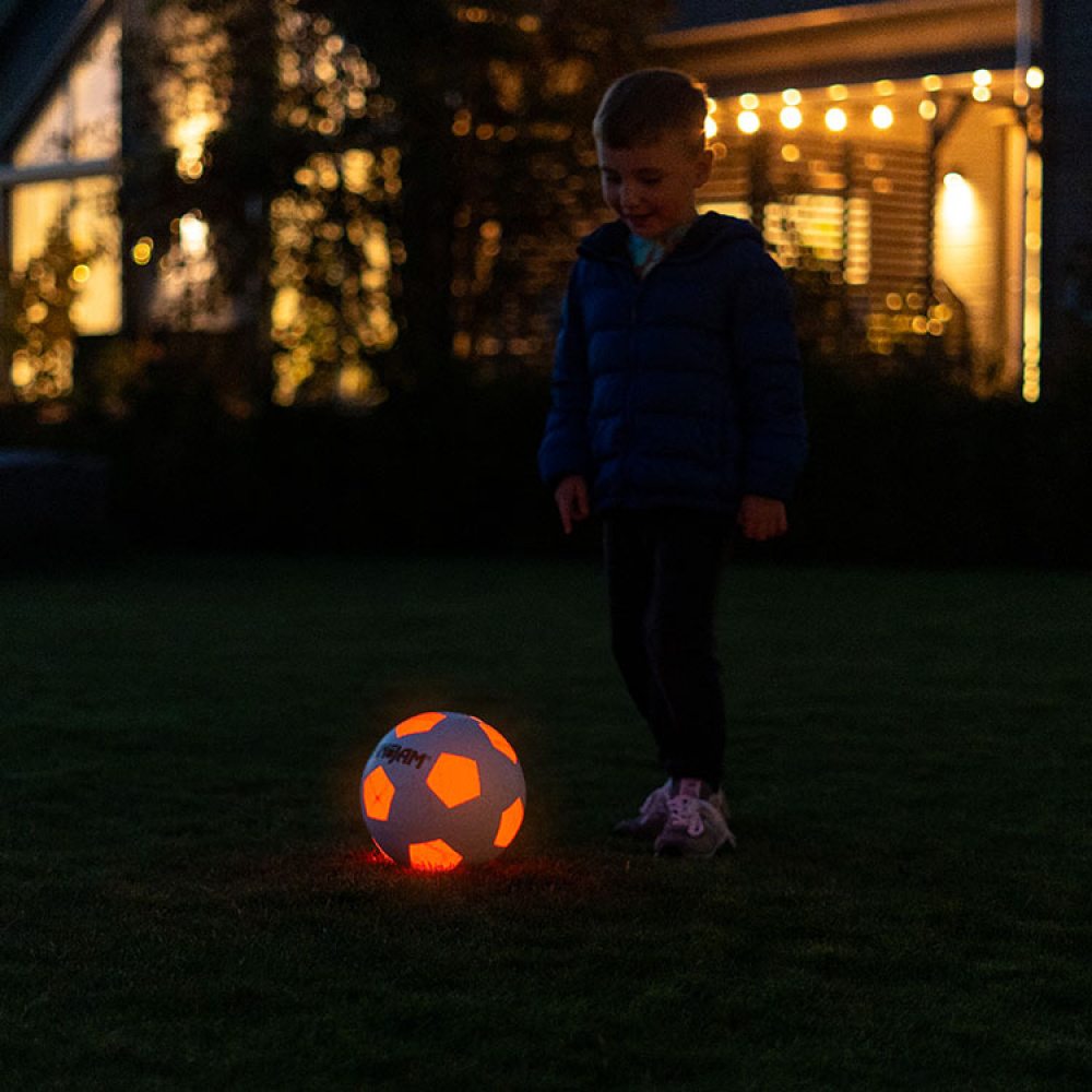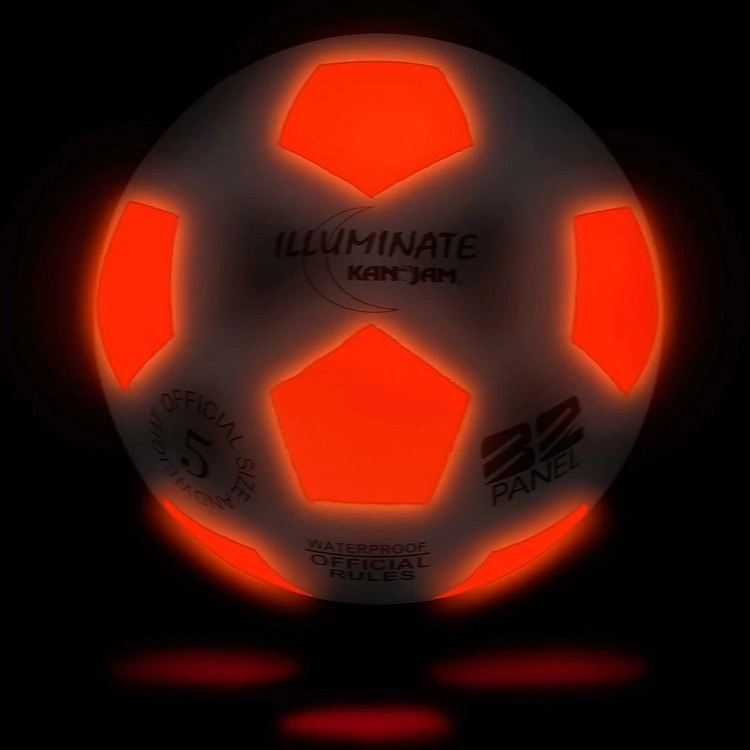 Med en KanJam skinnende fotball med sjokkaktiverte lys, blir det morsommere å spille fotball selv etter mørkets frembrudd. Fotballens LED-lys lyser så lenge du spiller og slukker automatisk når ballen har ligget stille i ca. 1 minutt.