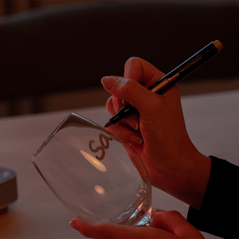 La gjestene merke sine egne glass ved ankomst eller under festen for å unngå forvekslinger og minimere ekstra oppvask.Hurtigtørkende blekk