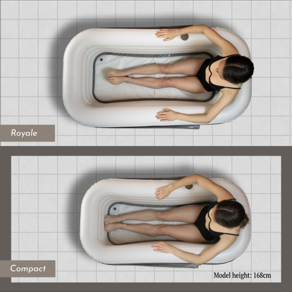 Tubble COMPACT og Tubble ROYAL. Tubble ROYAL er større enn Tubble COMPACT. Se de ulike modellenes dimensjoner under og velg badekaret som passer ditt bad.
