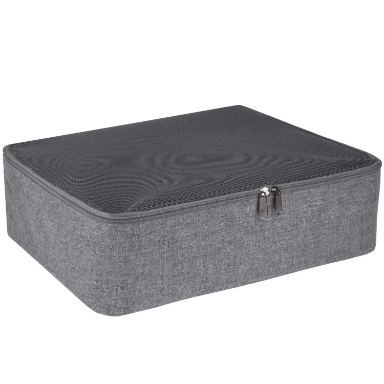 Pakkekuben er lett og sammenleggbar og har doble glidelåser som gjør den enkel å åpne og lukke. Nettingen på toppen av pakkekuben sørger for at klærne er ventilert og du trenger ikke å åpne pakkekuben for å se hva du har pakket med deg. Med håndtaket på den ene kortenden kan du lettere løfte opp kuben med alle klærne i.Passer i de fleste kommodeskuffer
