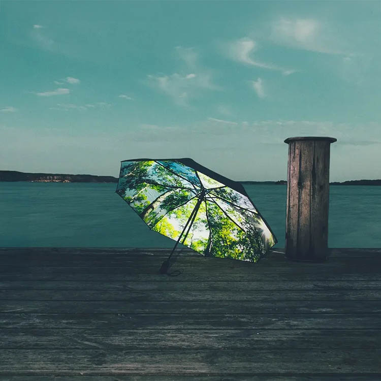 Paraplyet finnes med flere fotomotiv inspirert av naturens former og miljøer. Innsiden har et dekorativt uttrykk mens utsiden er svart for et tidløst og diskret utseende.Smart etui for enkel oppbevaring
