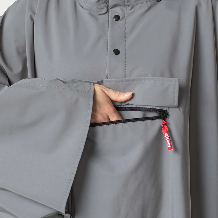 Trykknapper ved halsåpningen gjør det lett å ta på ponchoen og gir bedre passform. Det finnes også trykknapper langs sidene som holder ponchoen på plass og hindrer den i å blafre i vinden under sykkelturer.Innebygd oppbevaringspose
