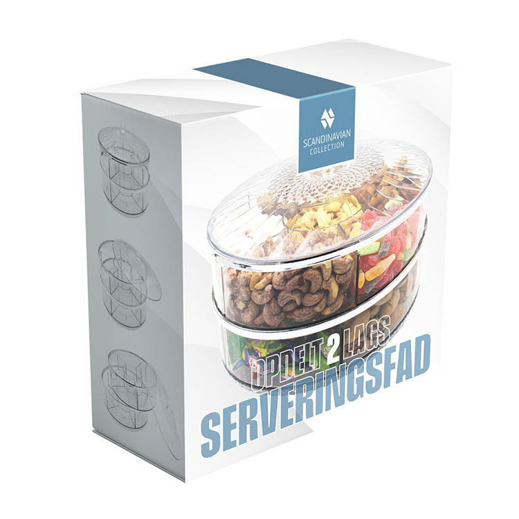 Serveringsfatet har seks separate rom per etasje som holder innholdet tydelig oppdelt - perfekt for snacks, frukt, tapas, godteri, nøtter eller andre småretter. Det passer like bra på hverdagsbordet som til festdekkingen og buffeer. Den gjennomtenkte oppdelingen forhindrer at smaker blandes og gjør fatet også anvendelig for å oppbevare småting som smykker, hårtilbehør, kontormateriell eller skjønnhetsprodukter.Dreifunksjon for smidig servering