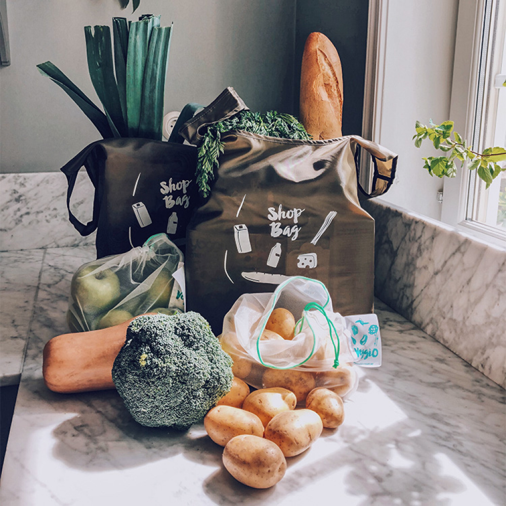Shoppingsettet består av fire store shoppingposer og seks små poser til frukt og grønt som ligger lettvint pakket i et praktisk futteral. De ulike posene ligger i to ulike lommer som kan åpnes fra sidene. På den måten unngår du å blande sammen de ulike posene og kan raskt ta ut posen du ønsker å bruke. Futteralets praktiske karabinkrok gjør at du kan henge shoppingsettet på en krok i gangen eller på handlevognen i butikken.