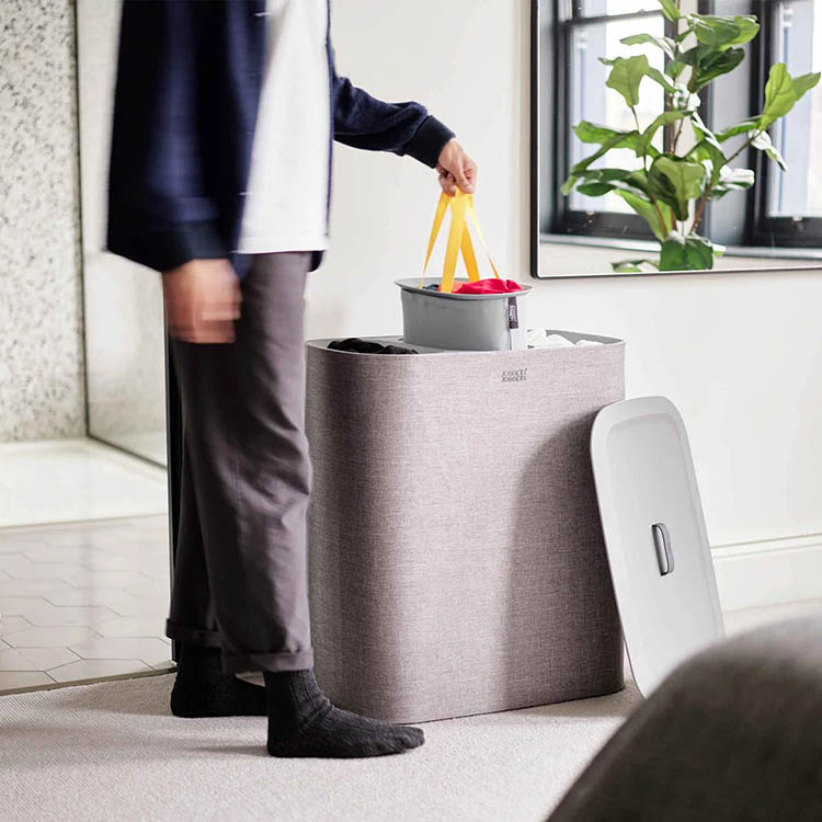 Hvert rom rommer 30 liter og er ideelt for å skille tøyet etter farge og type. De avtakbare skuffene er utstyrt med håndtak, noe som gjør det enkelt å bære tøyet til maskinen. TV-skuffene er også utstyrt med håndtak i bunnen, noe som gjør det enklere å legge dem direkte inn i TV-maskinen.TV-kurv med lokk