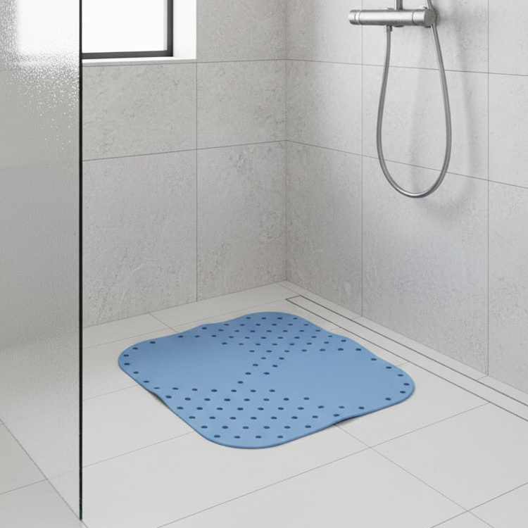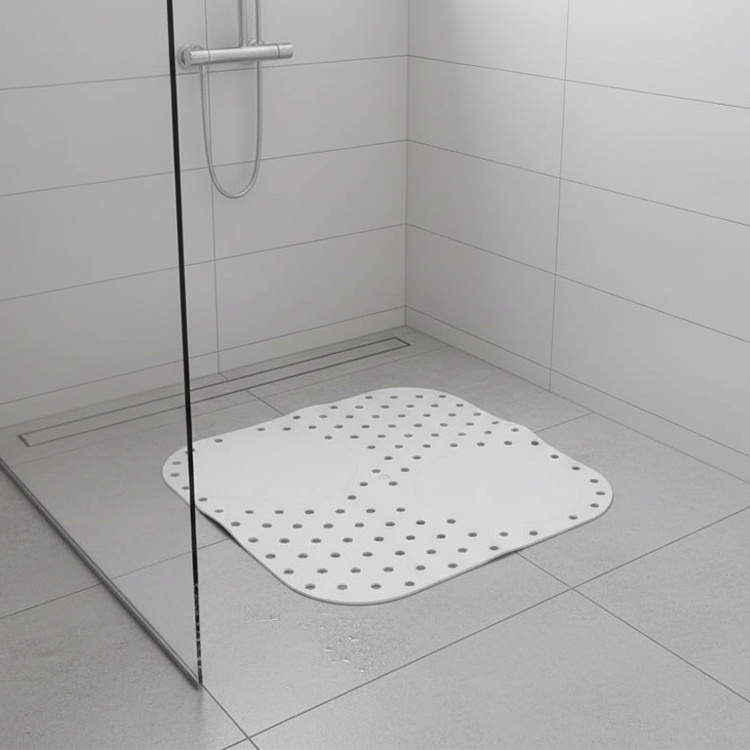 Den firkantede matten er 53,5 cm x 53,5 cm stor og har avrundede kanter. Dusjvannet kan renne gjennom hullene i matten og videre ned i avløpet.