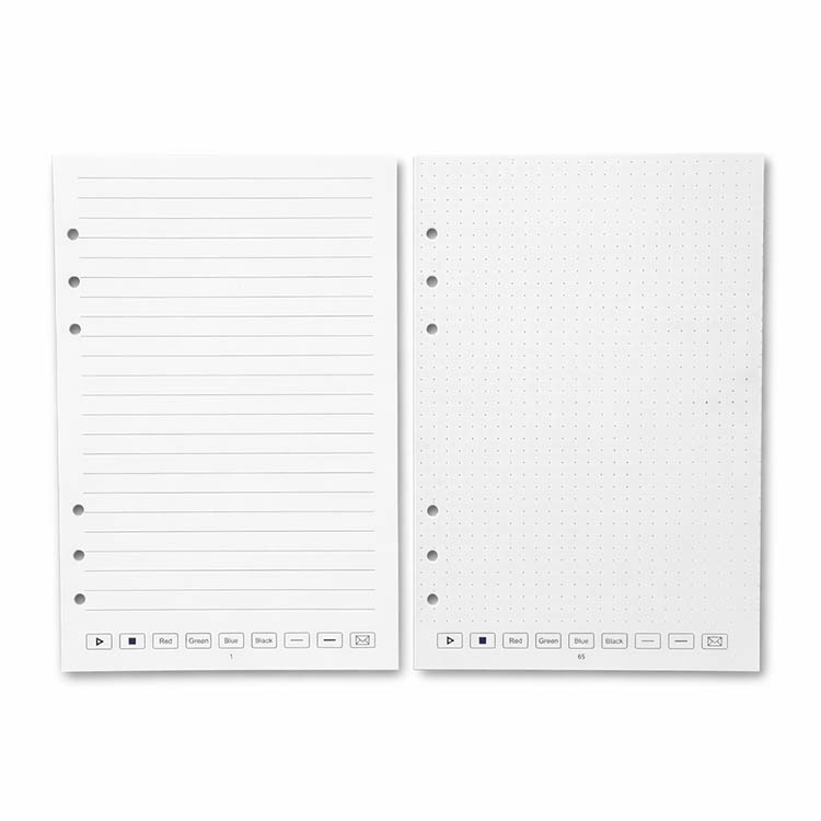 Notatboken inneholder 128 sider utslettbart papir, både linjert og prikket. Fukt den medfølgende servietten eller et husholdningspapir for å slette og gjenbruke sidene.