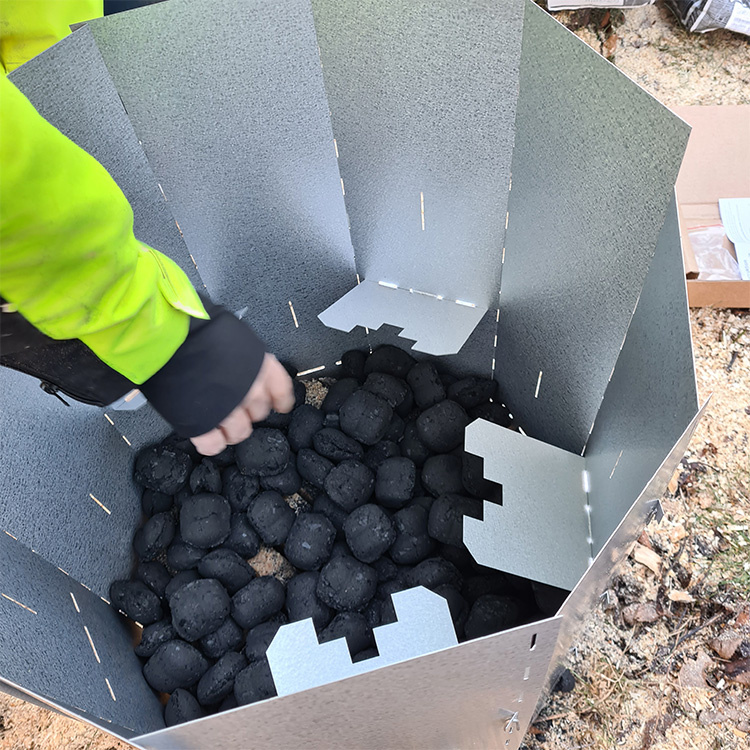 5. Plasser stubbeskorsteinen rundt stubben slik at den kan stå stødig. Juster høyden på metallsidene der det er nødvendig og tett med jord under metallsidene. Det er viktig å tette spalter på undersiden da hullene i metallsidene er tilpasset optimal luftstrøm. Ellers vil brikettene brenne for raskt dersom luft også kommer inn nedenfra.