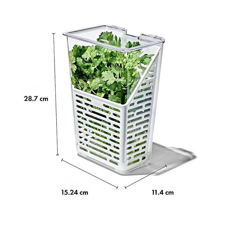Herb Keeper er laget av BPA-fri plast, noe som gjør den sikker for oppbevaring av mat. Urtebeholderen er dessuten oppvaskmaskinsikker, noe som forenkler rengjøringen og gjør at du kan bruke den om og om igjen uten ekstra anstrengelse.Spesifikasjoner